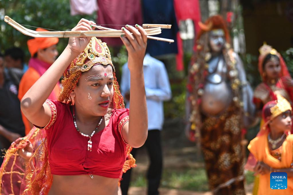 A child in traditional folk attire is seen during the Gajan festival on the outskirts of Agartala, capital city of India's northeastern state of Tripura, April 13, 2023. (Str/Xinhua)