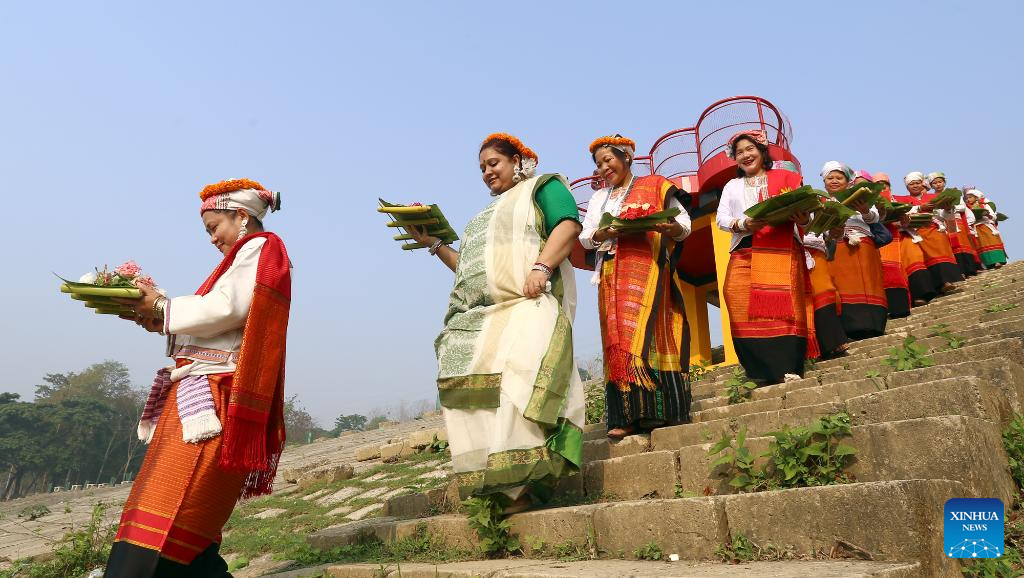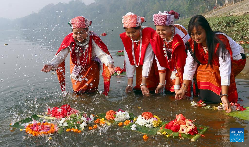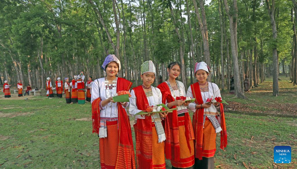 Women wearing traditional dresses and holding flowers are pictured during the celebration of the Boisabi festival in Chattogram, Bangladesh on April 12, 2023. With this festival, indigenous people in Chattogram Hill Tracts region bid farewell to the old year and welcome the new year. (Xinhua)