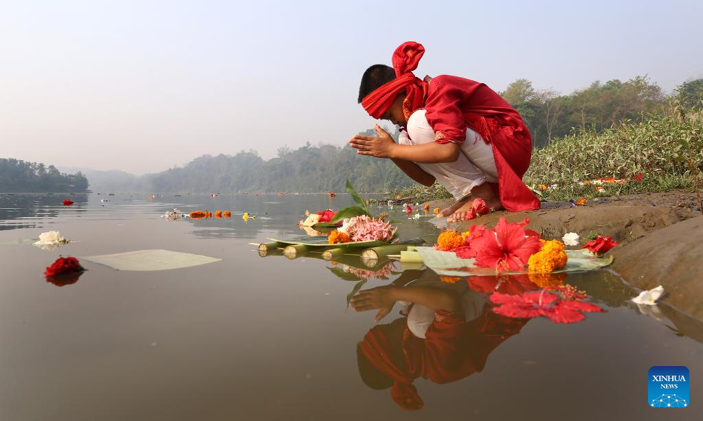 A boy prays before releasing floating flowers in a lake to celebrate the Boisabi festival in Chattogram, Bangladesh on April 12, 2023. With this festival, indigenous people in Chattogram Hill Tracts region bid farewell to the old year and welcome the new year. (Xinhua)