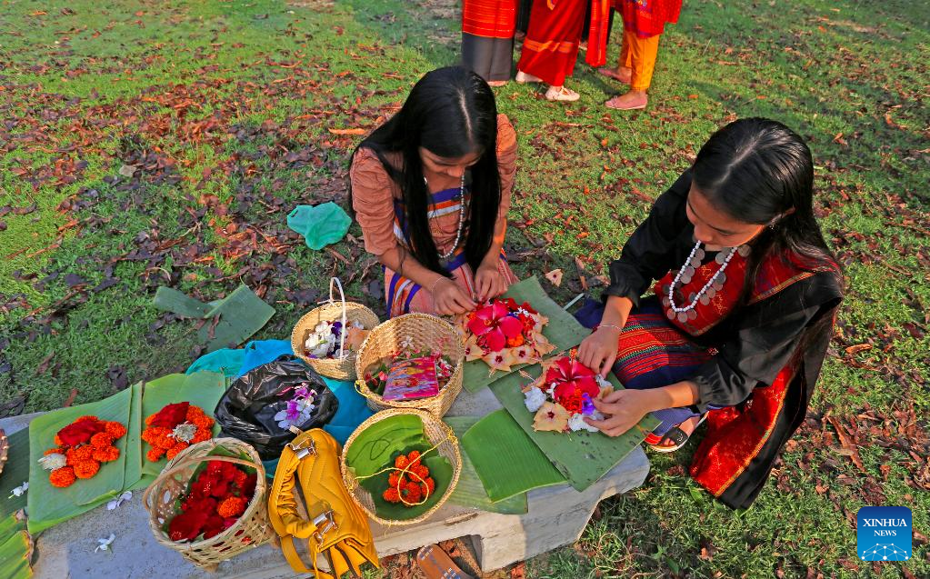 People prepare floating flowers to celebrate the Boisabi festival in Chattogram, Bangladesh on April 12, 2023. With this festival, indigenous people in Chattogram Hill Tracts region bid farewell to the old year and welcome the new year. (Xinhua)