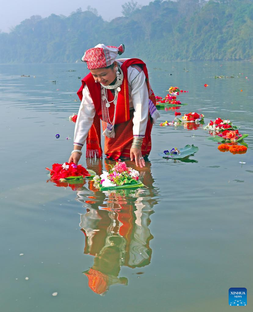A woman releases floating flowers in a lake to celebrate the Boisabi festival in Chattogram, Bangladesh on April 12, 2023. With this festival, indigenous people in Chattogram Hill Tracts region bid farewell to the old year and welcome the new year. (Xinhua)