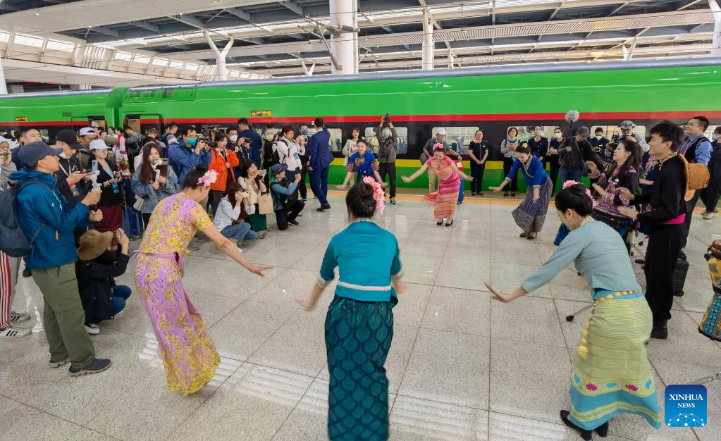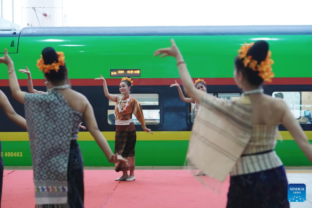 Performers dance during a launch ceremony for the first passenger train from Kunming to the Lao capital Vientiane at Kunming South Railway Station in Kunming, southwest China's Yunnan Province, April 13, 2023. (Xinhua/Wang Changshan)