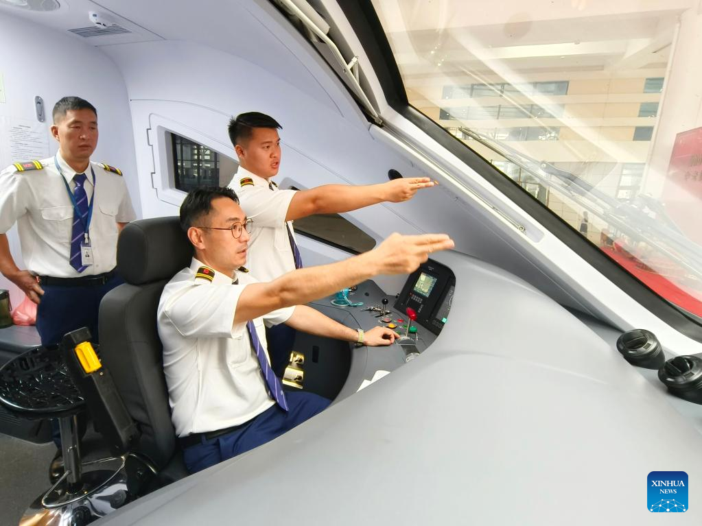 Crew members of a passenger train bound for the Lao capital Vientiane prepare for departure from Kunming South Railway Station in Kunming, southwest China's Yunnan Province, April 13, 2023. (Xinhua/Xing Guangli)