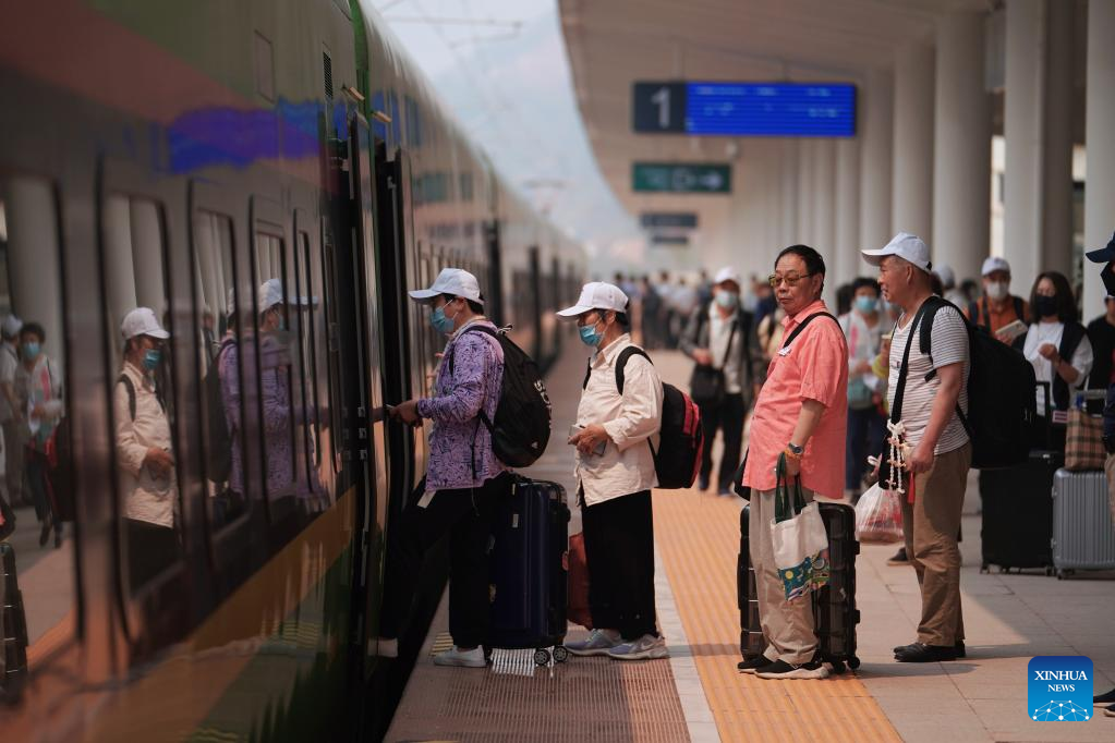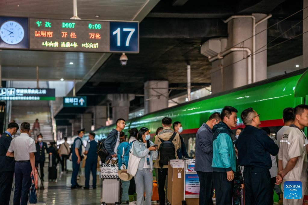Passengers prepare to board the first cross-border passenger train bound for the Lao capital Vientiane at Kunming South Railway Station in Kunming, southwest China's Yunnan Province, April 13, 2023. The China-Laos Railway started cross-border passenger services on Thursday, a move that is expected to boost regional connectivity. (Xinhua/Hu Chao)