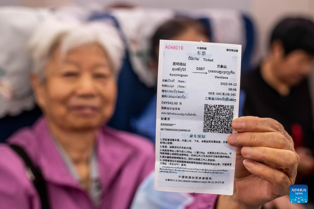 A passenger shows her ticket aboard the first cross-border passenger train from Kunming, southwest China's Yunnan Province to the Lao capital Vientiane on April 13, 2023. The China-Laos Railway started cross-border passenger services on Thursday, a move that is expected to boost regional connectivity. (Xinhua/Hu Chao)