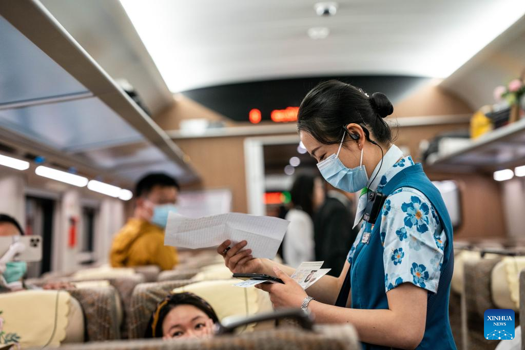 A train attendant checks a passenger's ticket and travel document aboard the first cross-border passenger train from Kunming, southwest China's Yunnan Province to the Lao capital Vientiane on April 13, 2023. The China-Laos Railway started cross-border passenger services on Thursday, a move that is expected to boost regional connectivity. (Xinhua/Hu Chao)