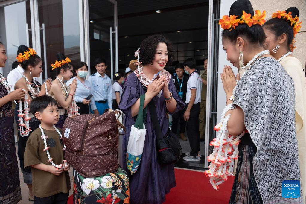 Lao staff members greet passengers taking the first cross-border passenger train from Kunming in southwest China's Yunnan Province to Lao capital Vientiane at the Boten Station of the China-laos Railway in Luang Namtha, Laos on April 13, 2023. The China-Laos Railway started cross-border passenger services on Thursday, a move that is expected to boost regional connectivity. (Photo by Kaikeo Saiyasane/Xinhua)