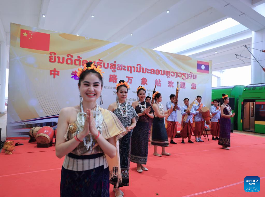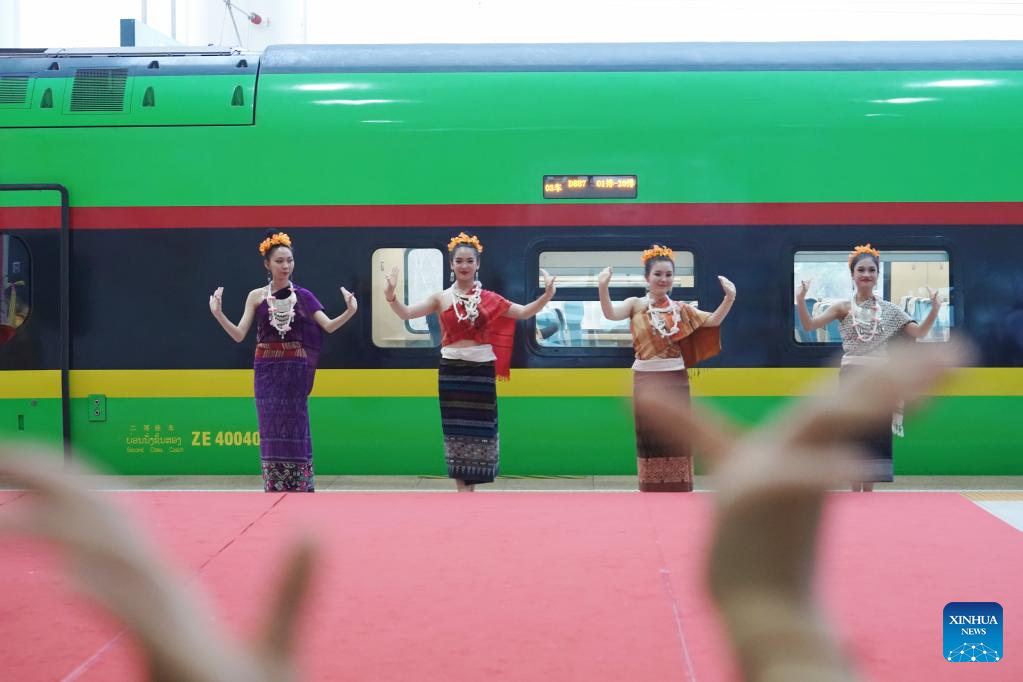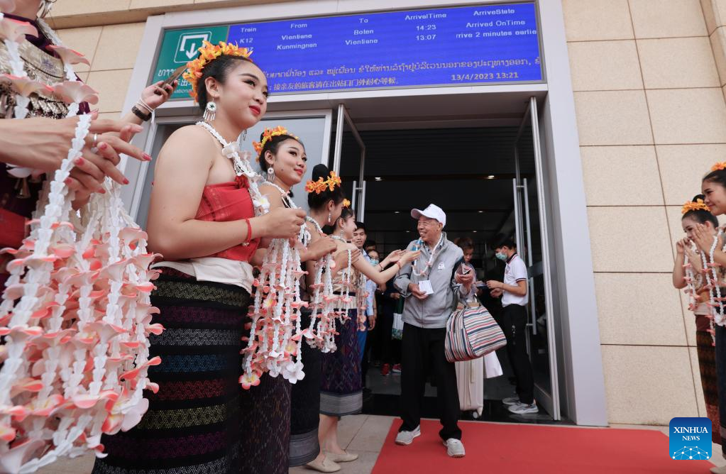 Lao staff members greet passengers taking the first cross-border passenger train from Kunming in southwest China's Yunnan Province to Lao capital Vientiane at the Boten Station of the China-laos Railway in Luang Namtha, Laos on April 13, 2023. The China-Laos Railway started cross-border passenger services on Thursday, a move that is expected to boost regional connectivity. (Xinhua/Xing Guangli)