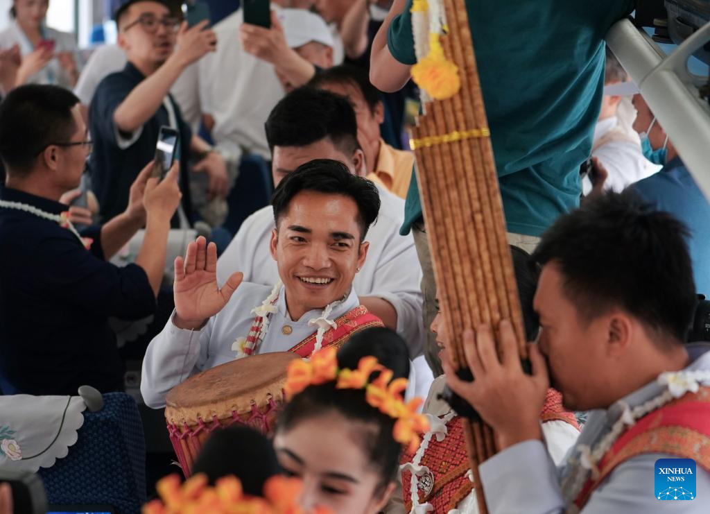 Lao staff members perform at the first cross-border passenger train from Kunming in southwest China's Yunnan Province to Lao capital Vientiane on April 13, 2023. The China-Laos Railway started cross-border passenger services on Thursday, a move that is expected to boost regional connectivity. (Xinhua/Xing Guangli)