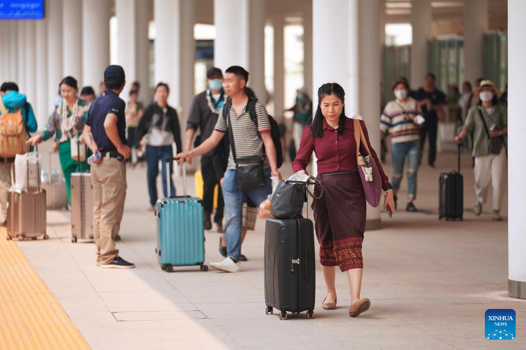 Passengers prepare to board the first cross-border passenger train from Kunming in southwest China's Yunnan Province to Lao capital Vientiane at the Boten Station of the China-laos Railway in Luang Namtha, Laos on April 13, 2023. The China-Laos Railway started cross-border passenger services on Thursday, a move that is expected to boost regional connectivity. (Xinhua/Xing Guangli)