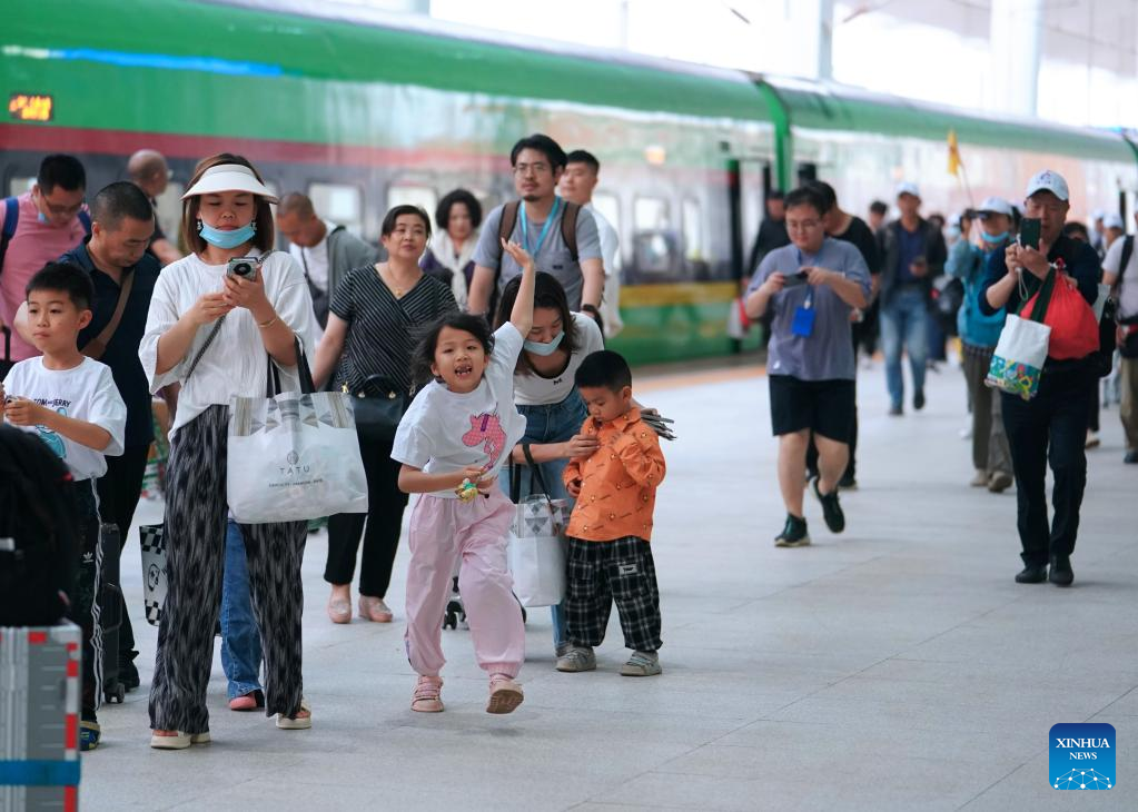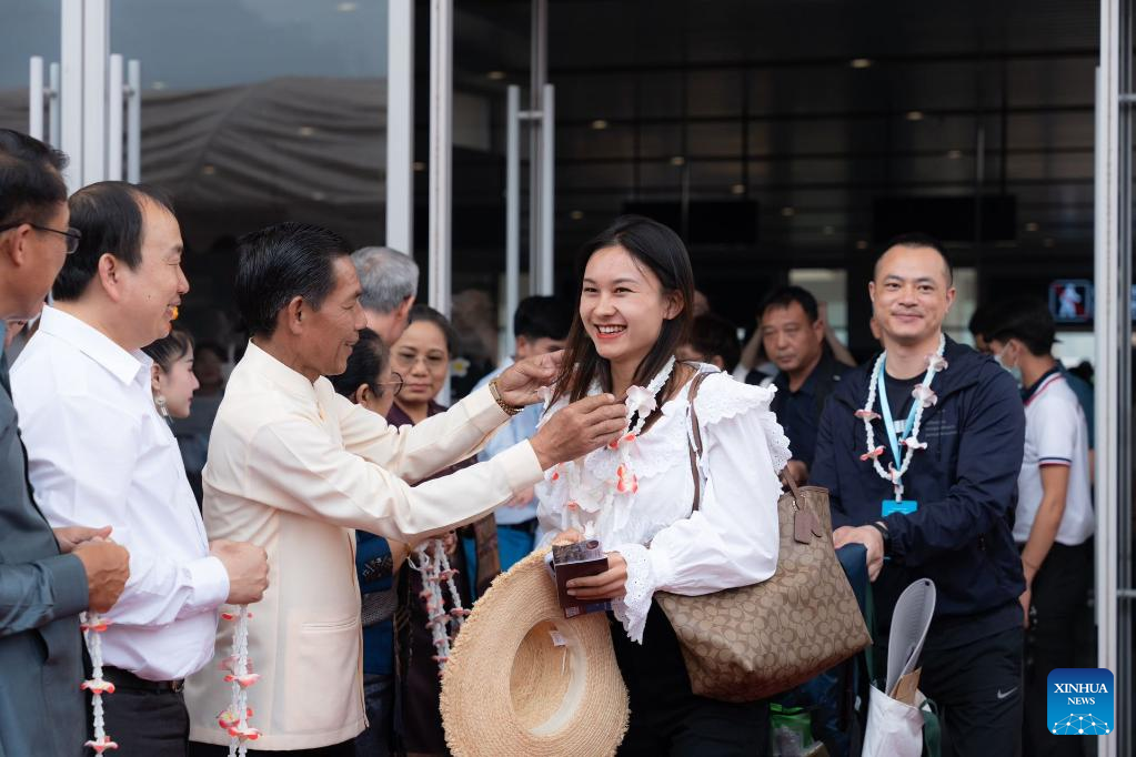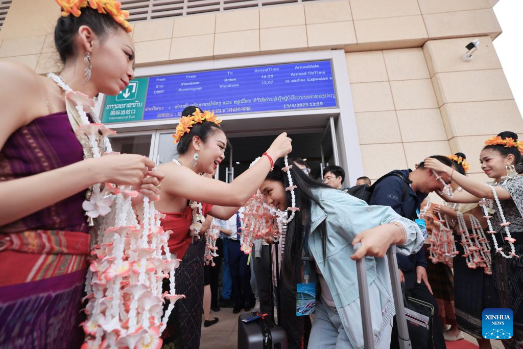 Passengers taking the first cross-border passenger train from Kunming in southwest China's Yunnan Province to Lao capital Vientiane, arrive at the Vientiane station of the China-laos Railway in Vientiane, Laos, April 13, 2023. The China-Laos Railway started cross-border passenger services on Thursday, a move that is expected to boost regional connectivity. (Xinhua/Xing Guangli)