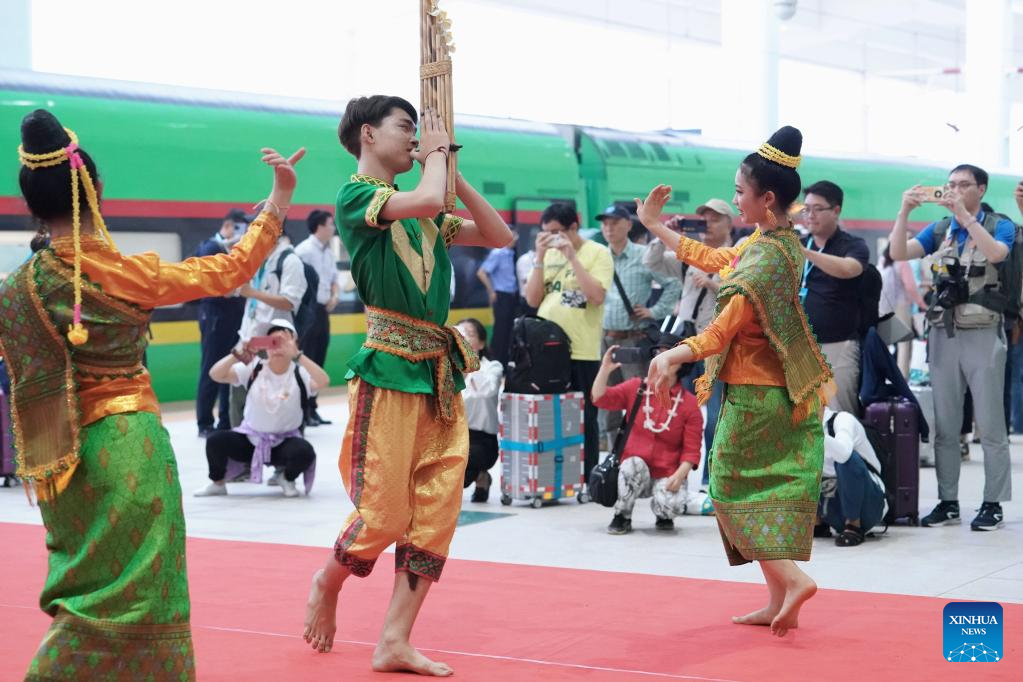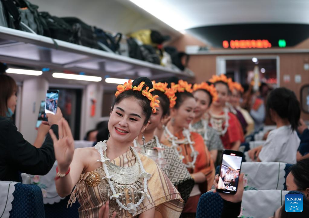 An art performance is staged aboard the first cross-border passenger train from Kunming, southwest China's Yunnan Province to the Lao capital Vientiane on April 13, 2023. The China-Laos Railway started cross-border passenger services on Thursday, a move that is expected to boost regional connectivity. (Xinhua/Hu Chao)