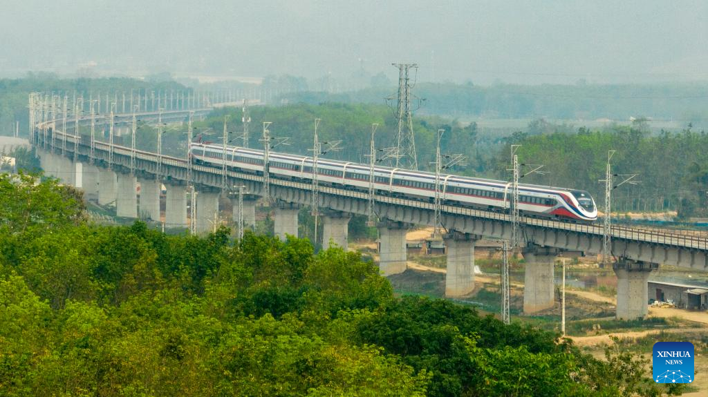 The first cross-border passenger train departed from the Lao capital Vientiane to Kunming in southwest China's Yunnan Province, runs on the Ganlanba bridge of the China-Laos railway in Xishuangbanna Dai Autonomous Prefecture, southwest China's Yunnan Province, April 13, 2023. The China-Laos Railway started cross-border passenger services on Thursday, a move that is expected to boost regional connectivity. (Xinhua/Shan Yuqi)