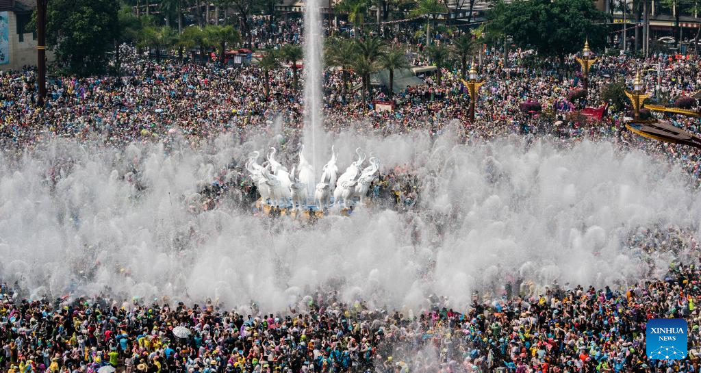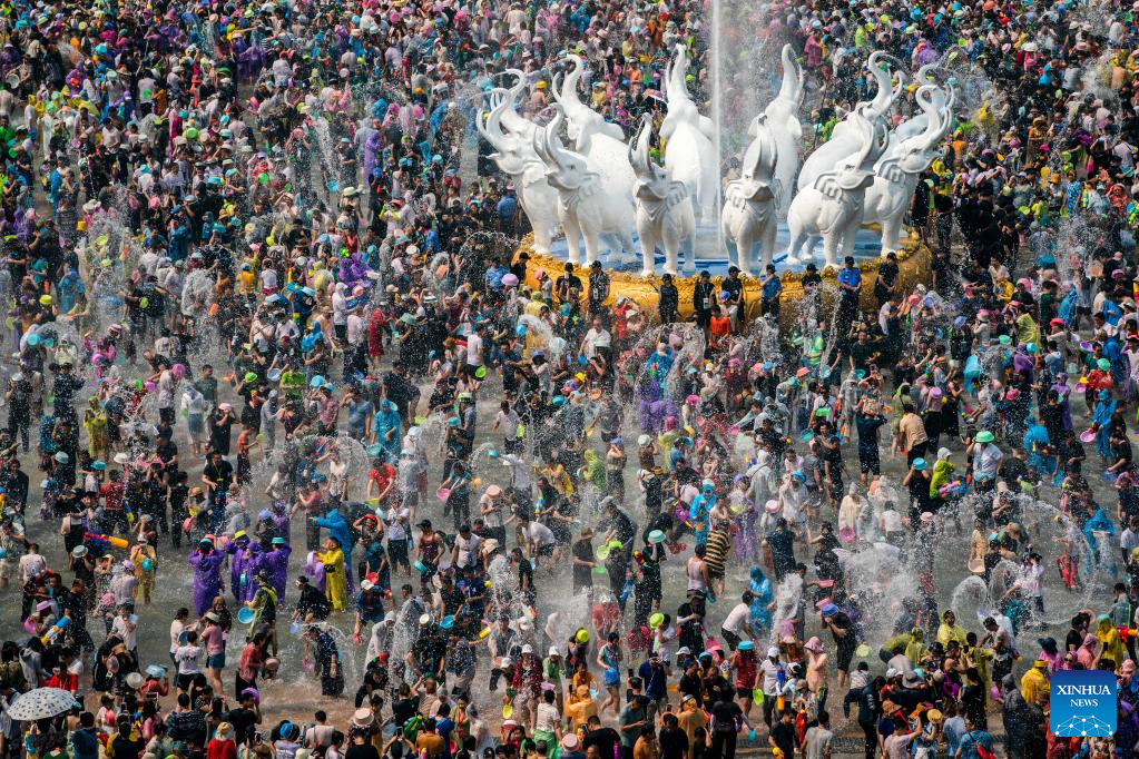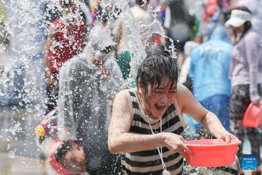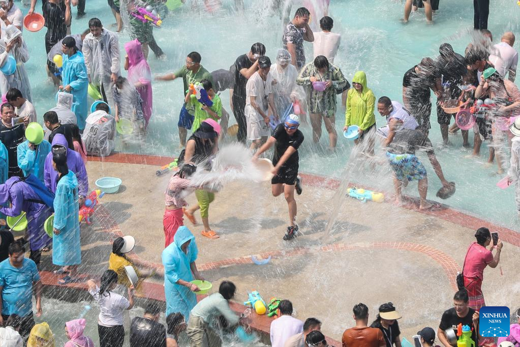 People splash water on one another to celebrate the water-splashing festival at a square in Jinghong City, Dai Autonomous Prefecture of Xishuangbanna, southwest China's Yunnan Province, April 15, 2023. (Xinhua/Hu Chao)