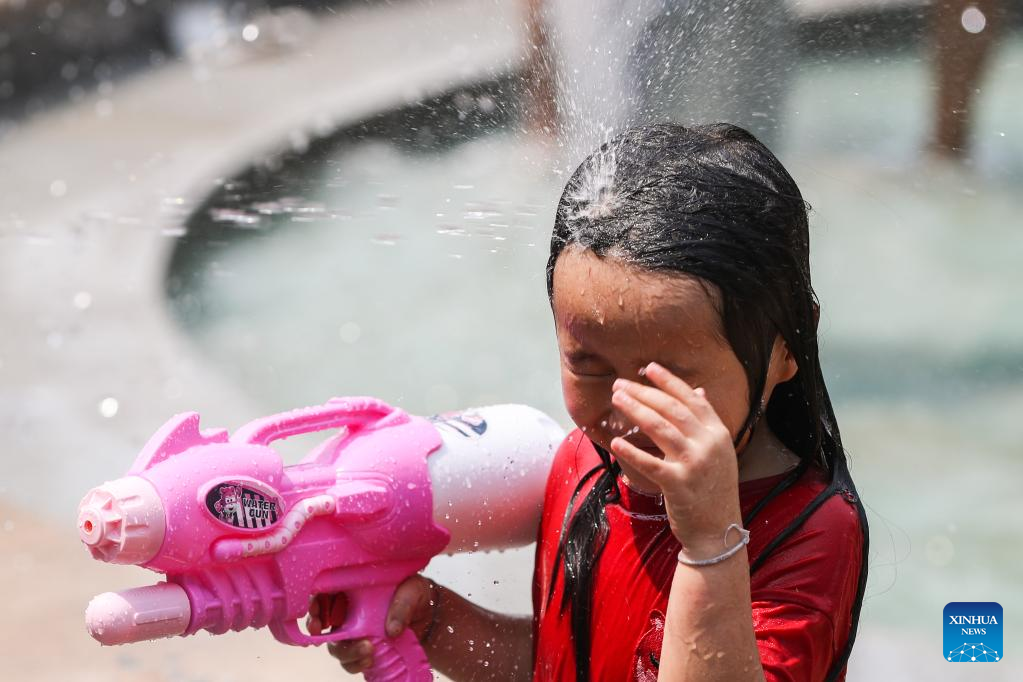 A girl plays with a toy water gun during the celebration of water-splashing festival at a square in Jinghong City, Dai Autonomous Prefecture of Xishuangbanna, southwest China's Yunnan Province, April 15, 2023. (Xinhua/Shan Yuqi)