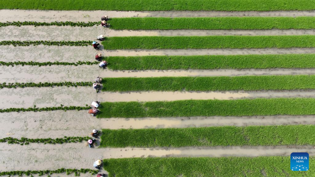This aerial photo taken on April 17, 2023 shows farmers transplanting rice seedlings in Hemu Village of Deqing County, Huzhou, east China's Zhejiang Province. Farmers across China are busy with agricultural production in spring. (Photo by Xie Shangguo/Xinhua)