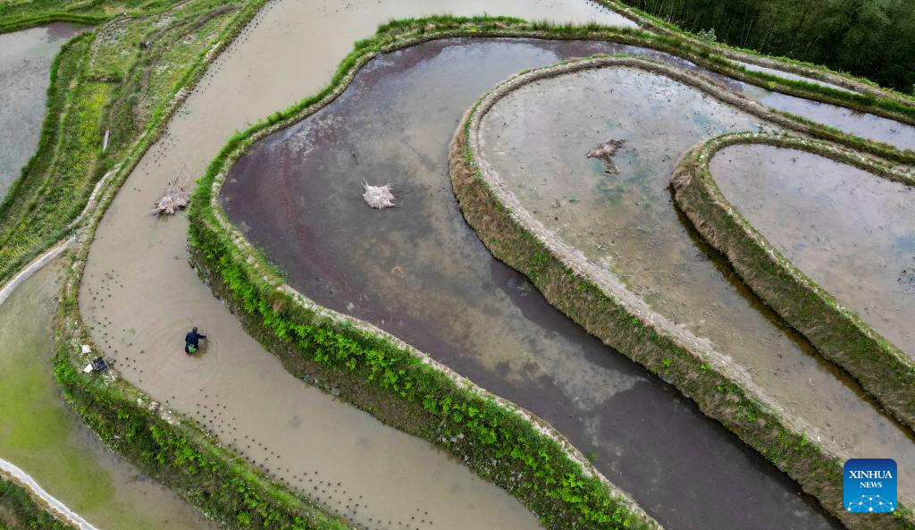 This aerial photo taken on April 17, 2023 shows a villager working in terraced fields in Jiabang Town of Congjiang County, Qiandongnan Miao and Dong Autonomous Prefecture, southwest China's Guizhou Province. Farmers across China are busy with agricultural production in spring. (Photo by Lu Zhongnan/Xinhua)