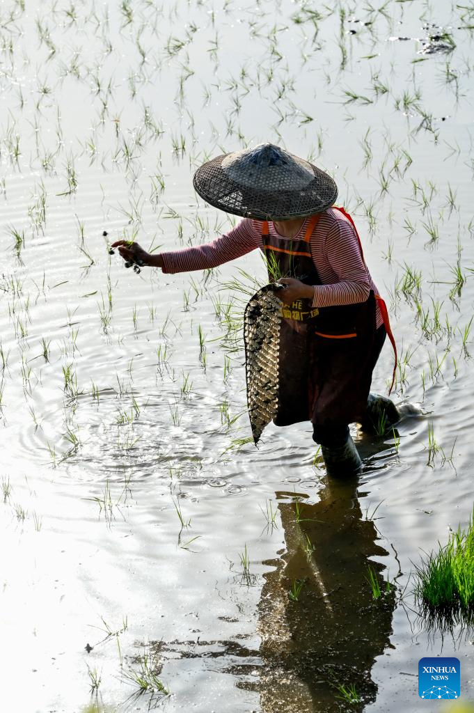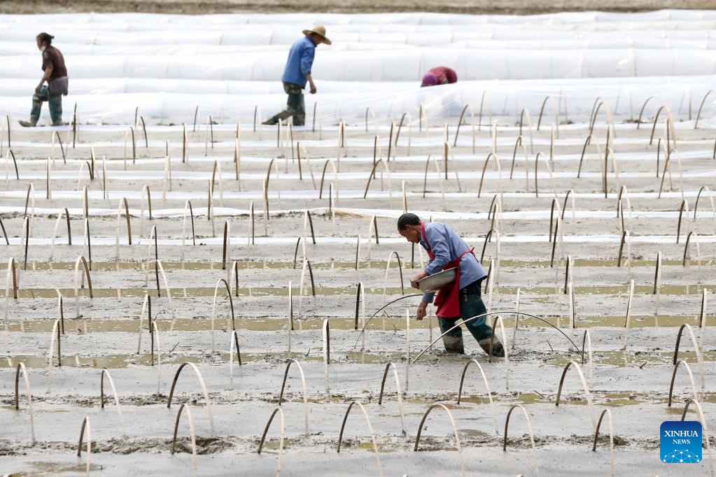 A farmer plants seedlings in Huaqiao Village of Jingzi Town, Shuangfeng County, Loudi, central China's Hunan Province, April 17, 2023. Farmers across China are busy with agricultural production in spring. (Photo by Li Jianxin/Xinhua)