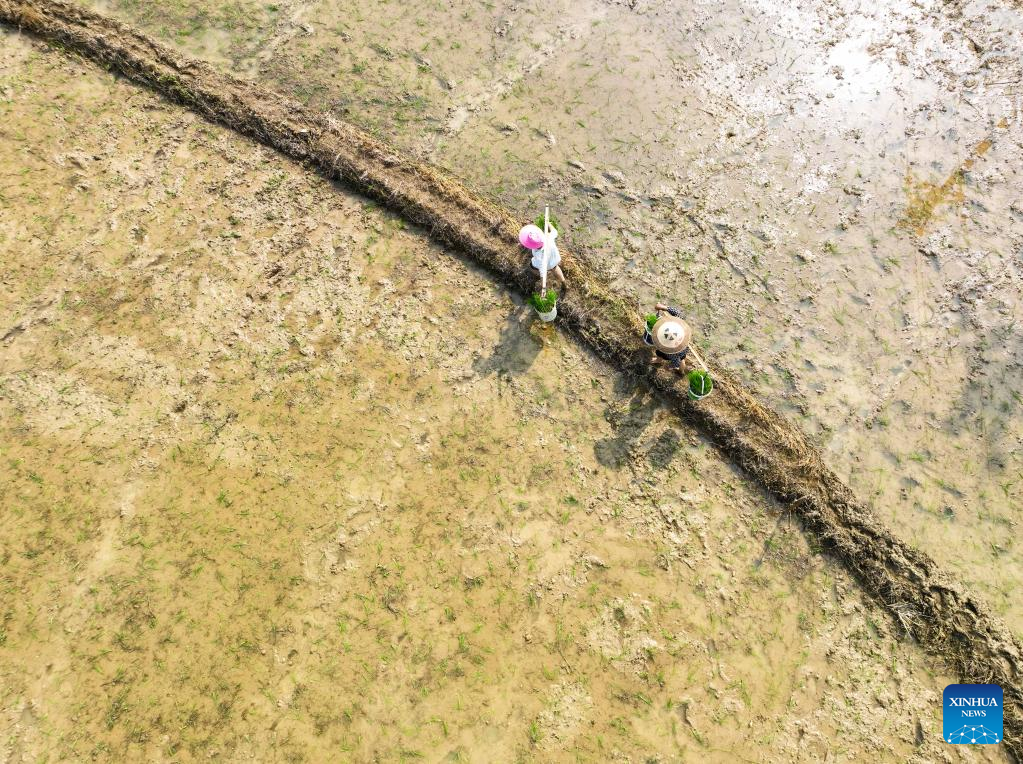 This aerial photo taken on April 17, 2023 shows farmers transporting seedlings in Zhangwufang Village of Baimadu Township, Daoxian County, Yongzhou, central China's Hunan Province. Farmers across China are busy with agricultural production in spring. (Photo by Jiang Keqing/Xinhua)