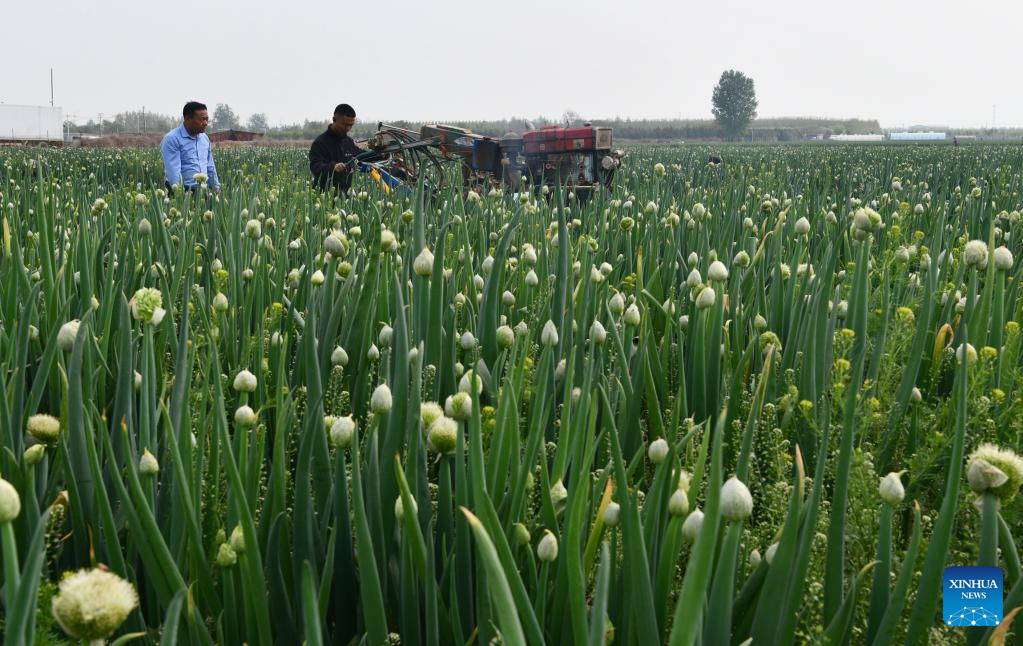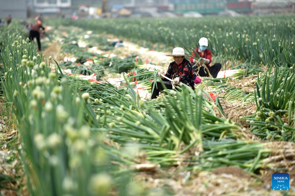 Farmers harvest green Chinese onion in Chenglang Village of Luancheng District, Shijiazhuang, north China's Hebei Province, April 17, 2023. Farmers across China are busy with agricultural production in spring. (Photo by Li Mingfa/Xinhua)
