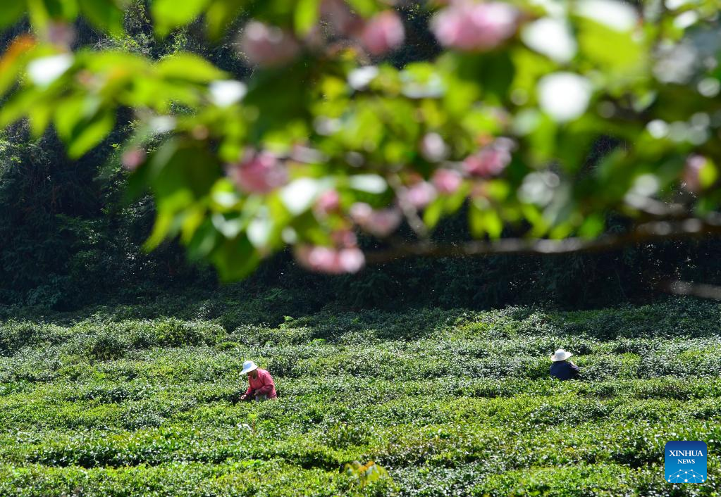 Farmers pick tea leaves at a tea garden in Binhu District of Wuxi City, east China's Jiangsu Province, April 17, 2023. Farmers across China are busy with agricultural production in spring. (Photo by Huan Yueliang/Xinhua)