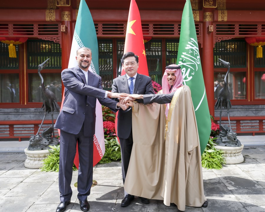 Chinese State Councilor and Foreign Minister Qin Gang meet with Saudi Arabian Foreign Minister Prince Faisal bin Farhan Al Saud and Iranian Foreign Minister Hossein Amir-Abdollahian in Beijing, capital of China, April 6, 2023. (Xinhua/Ding Lin)