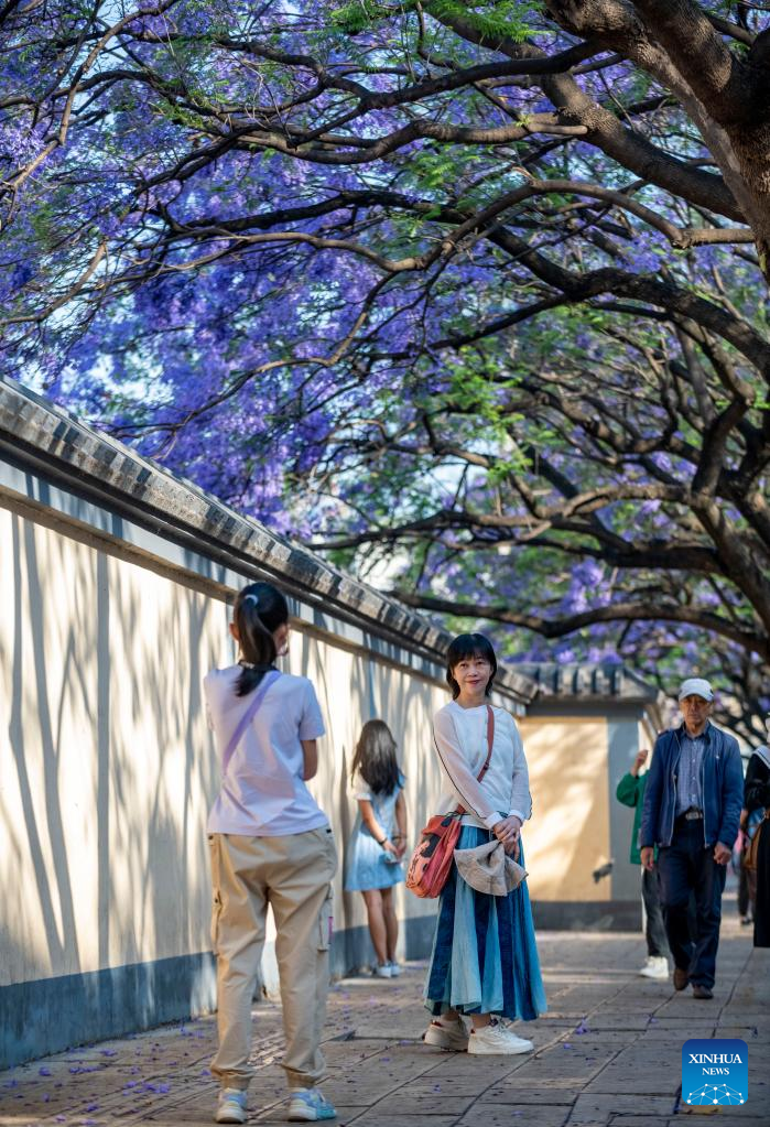 Visitors take photos with jacaranda trees in full bloom in Kunming, southwest China's Yunnan Province, April 22, 2023. (Xinhua/Chen Xinbo)