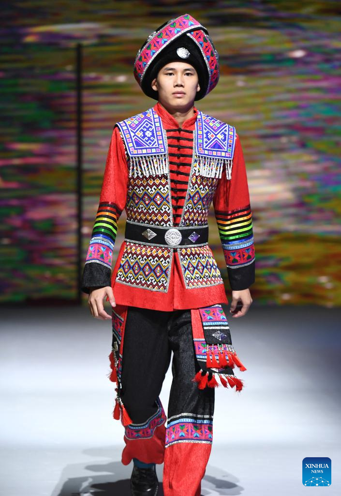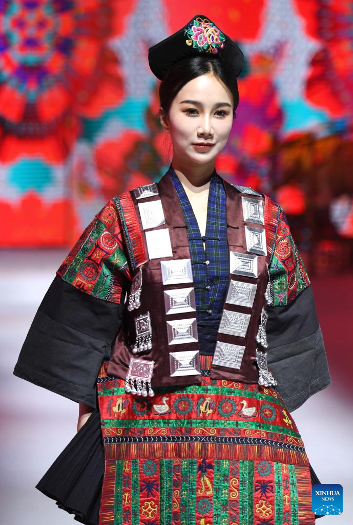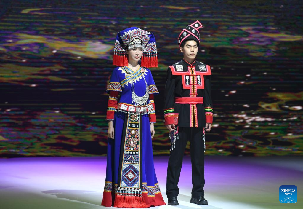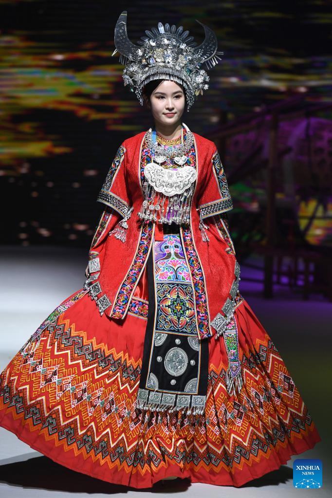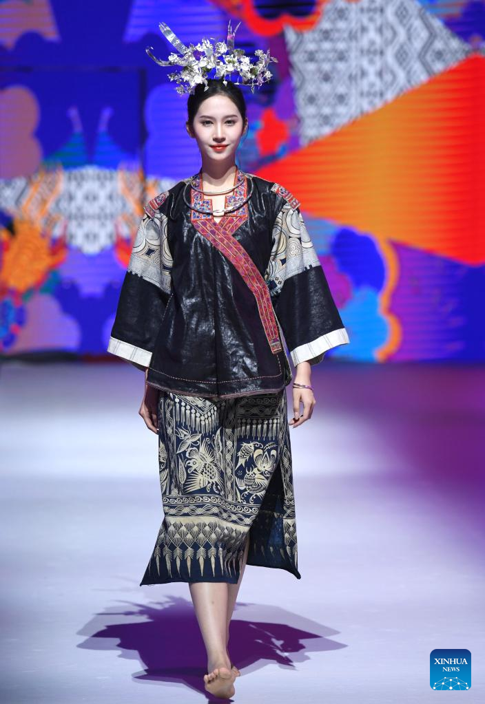 A model presents an ethnic costume during a costume show in Nanning, south China's Guangxi Zhuang Autonomous Region, April 24, 2023. (Xinhua/Zhou Hua)