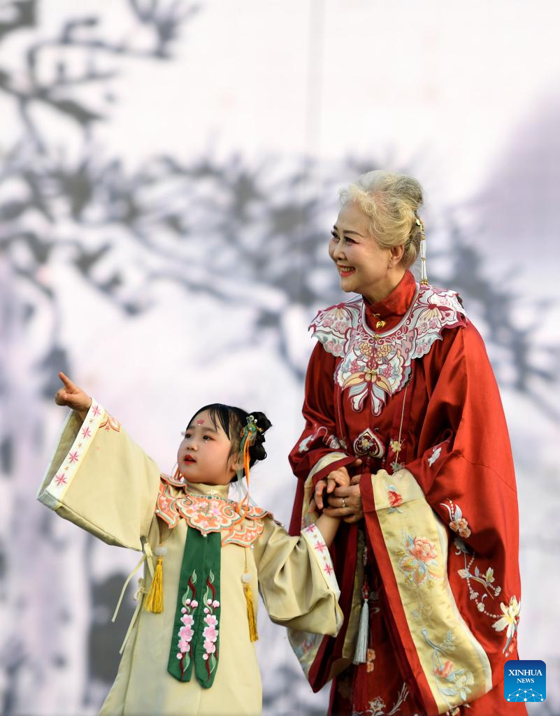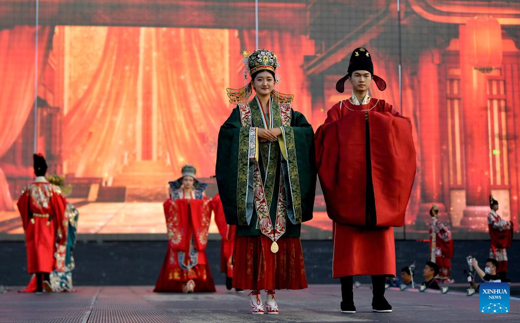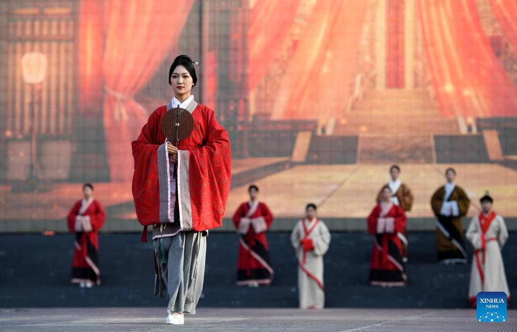 A traditional costume show is held at the Great Tang All Day Mall in Xi'an, northwest China's Shaanxi Province, April 25, 2023. (Xinhua/Liu Xiao)