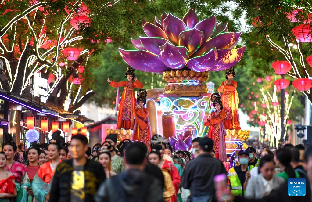 People watch a float parade at the Great Tang All Day Mall in Xi'an, northwest China's Shaanxi Province, April 25, 2023. (Xinhua/Liu Xiao)