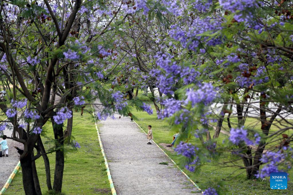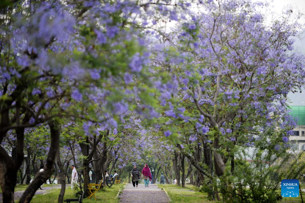 People walk under blooming jacaranda trees in Islamabad, Pakistan, on May 2, 2023. (Xinhua/Ahmad Kamal)