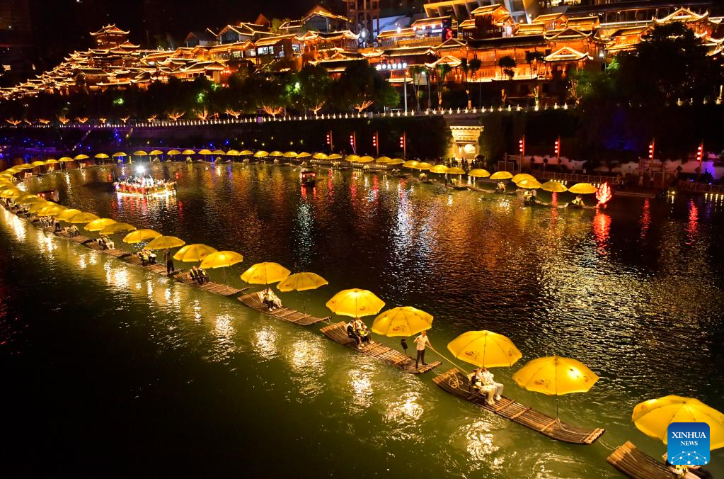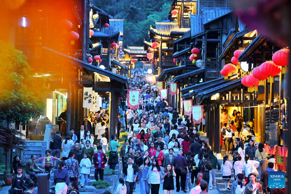 Tourists visit Youzhou ancient town of Youyang Tujia and Miao Autonomous County, southwest China's Chongqing Municipality, May 1, 2023. (Photo by Chen Bisheng/Xinhua)