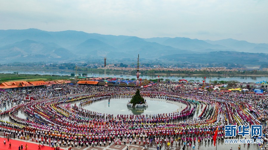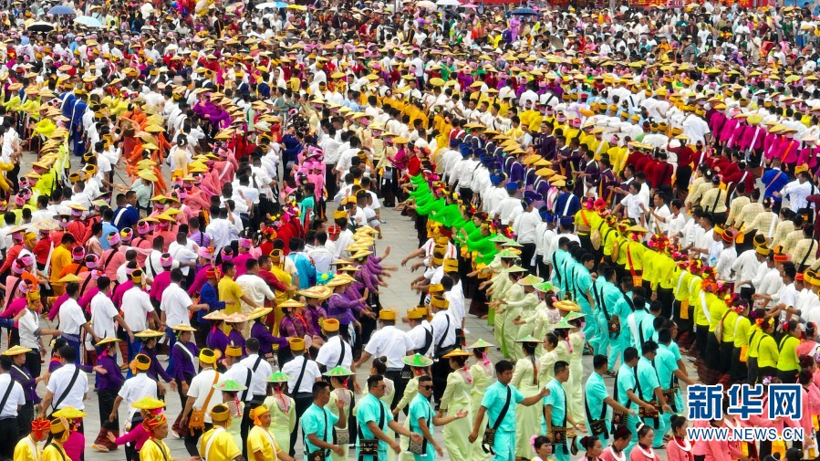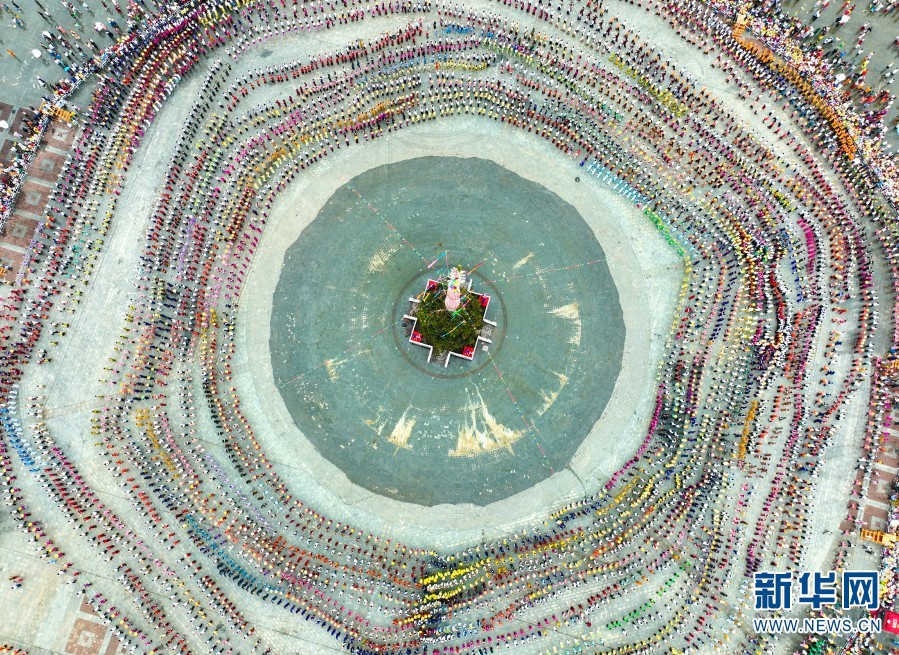 Aerial photo taken on May 1 shows people of all ethnic groups dancing and singing. (Xinhua/Yin Yihu)