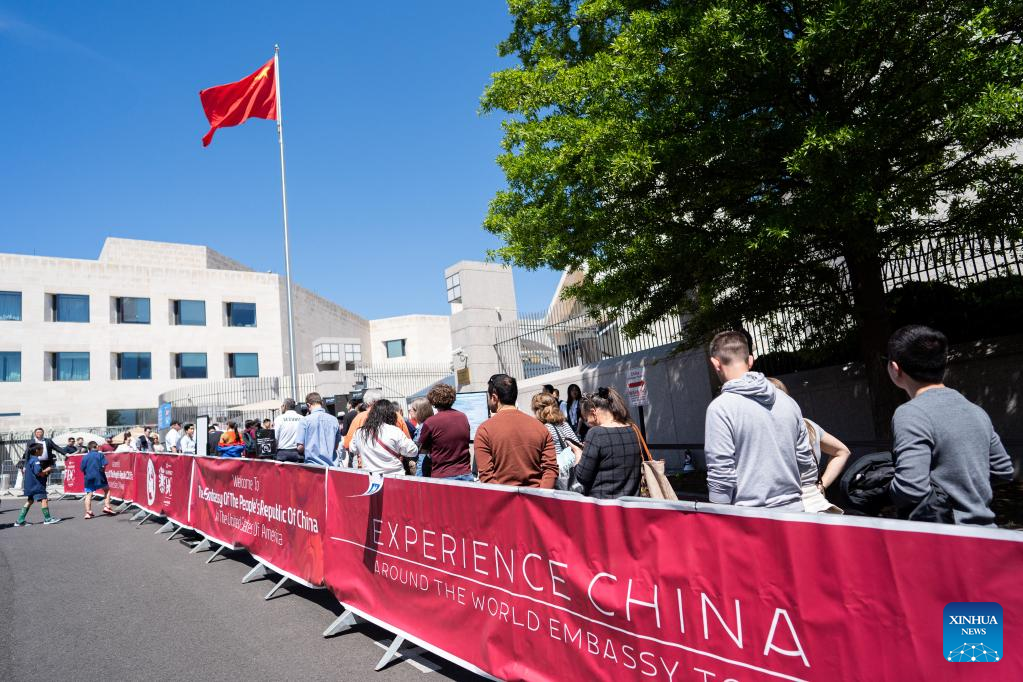 Visitors queue up outside the Chinese Embassy in the United States in Washington, D.C., the United States, on May 6, 2023. The Chinese Embassy in the United States joined the Around the World Embassy Tour of Washington D.C. and held an open house event themed "Yunnan: A Many-Splendored Life" presenting the southwestern Chinese province on Saturday. (Xinhua/Liu Jie)