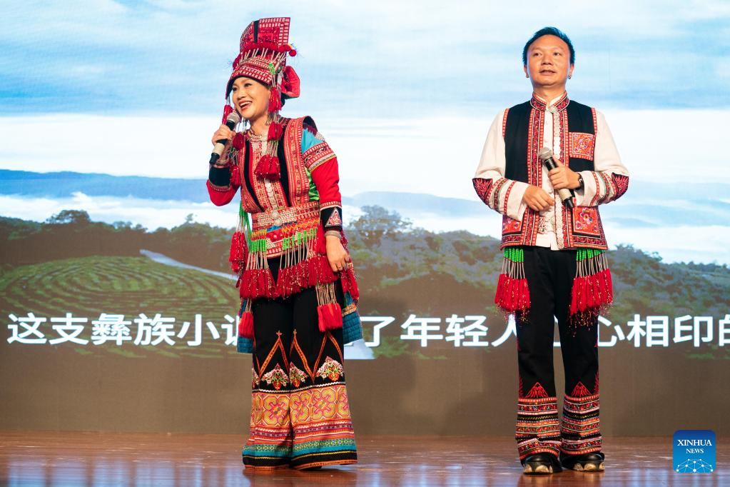 Artists perform a folk song of Yi ethnic group at the Chinese Embassy in the United States in Washington, D.C., the United States, on May 6, 2023. The Chinese Embassy in the United States joined the Around the World Embassy Tour of Washington D.C. and held an open house event themed "Yunnan: A Many-Splendored Life" presenting the southwestern Chinese province on Saturday. (Xinhua/Liu Jie)