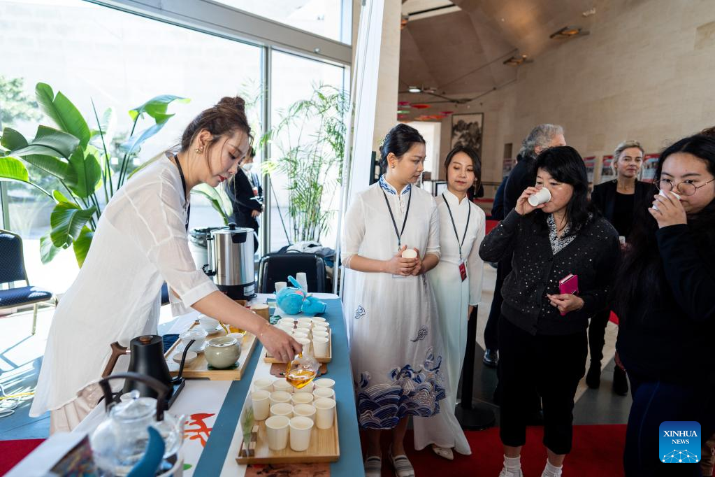 Visitors taste Chinse tea at the Chinese Embassy in the United States in Washington, D.C., the United States, on May 6, 2023. The Chinese Embassy in the United States joined the Around the World Embassy Tour of Washington D.C. and held an open house event themed "Yunnan: A Many-Splendored Life" presenting the southwestern Chinese province on Saturday. (Xinhua/Liu Jie)