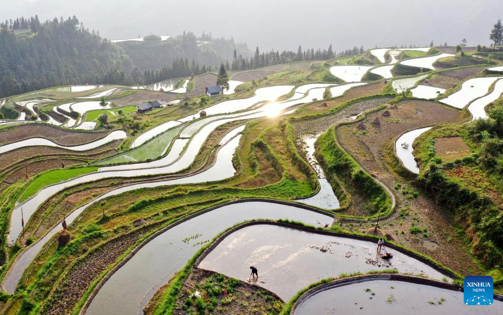 This aerial photo taken on May 6, 2023 shows farmers working in terraced fields in Jiaye Village, Qiandongnan Miao and Dong Autonomous Prefecture, southwest China's Guizhou Province. Chinese farmers are busy with field works during "Lixia", the seventh solar term on the Chinese lunar calendar that marks the beginning of summer. (Photo by Luo Jinglai/Xinhua)