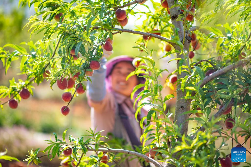 A farmer picks peaches at a peach base in Dehou Town, Wenshan City of southwest China's Yunnan Province, May 6, 2023. Chinese farmers are busy with field works during "Lixia", the seventh solar term on the Chinese lunar calendar that marks the beginning of summer. (Photo by Xiong Pingxiang/Xinhua)