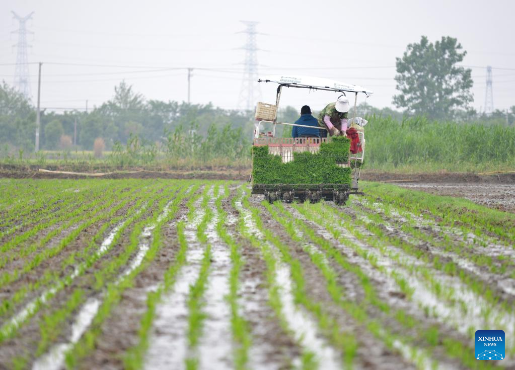 Farmers plant seedlings at a family farm in Zhonghan Town of Chaohu City, east China's Anhui Province, May 6, 2023. Chinese farmers are busy with field works during "Lixia", the seventh solar term on the Chinese lunar calendar that marks the beginning of summer. (Photo by Ma Fengcheng/Xinhua)