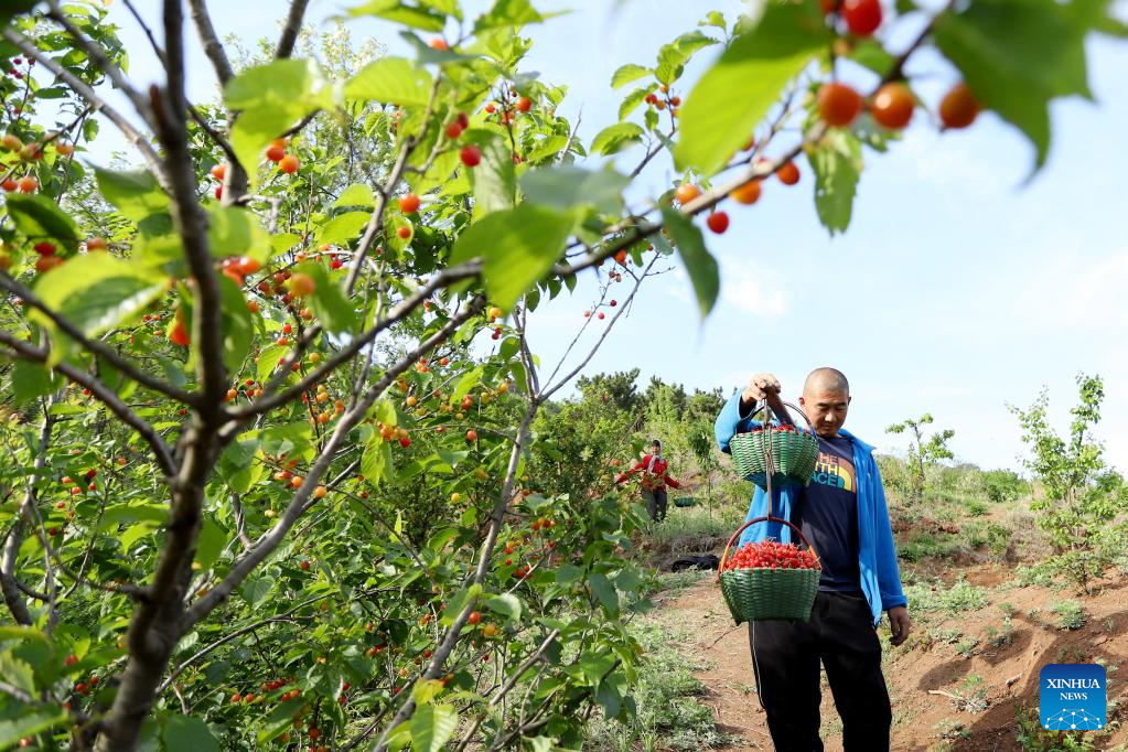 Farmers carry harvested cherries at a garden in Qingdao City, east China's Shandong Province, May 6, 2023. Chinese farmers are busy with field works during "Lixia", the seventh solar term on the Chinese lunar calendar that marks the beginning of summer. (Photo by Wang Peike/Xinhua)