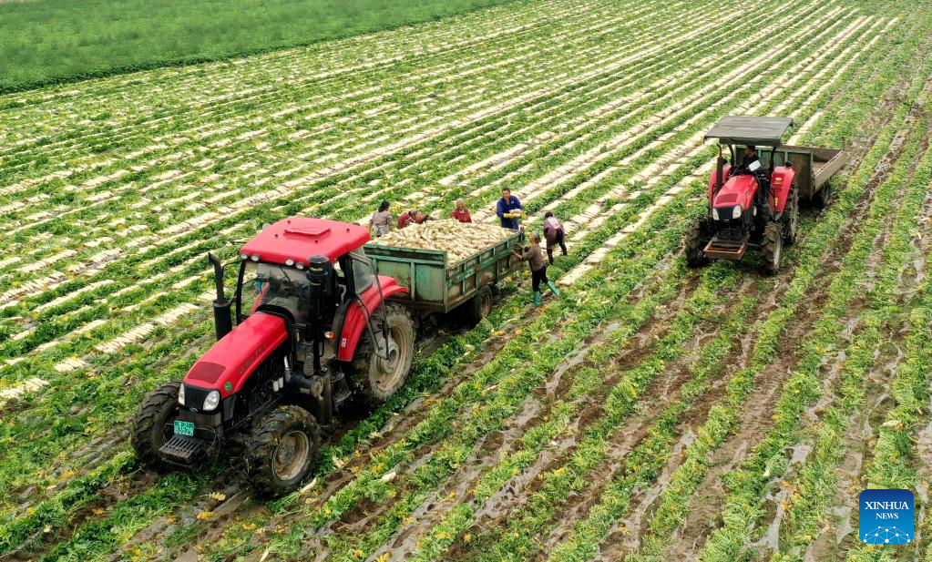 This aerial photo taken on May 6, 2023 shows farmers loading trucks with harvested radishes in Jishiba Village, Meishan City of southwest China's Sichuan Province. Chinese farmers are busy with field works during "Lixia", the seventh solar term on the Chinese lunar calendar that marks the beginning of summer. (Photo by Yao Yongliang/Xinhua)