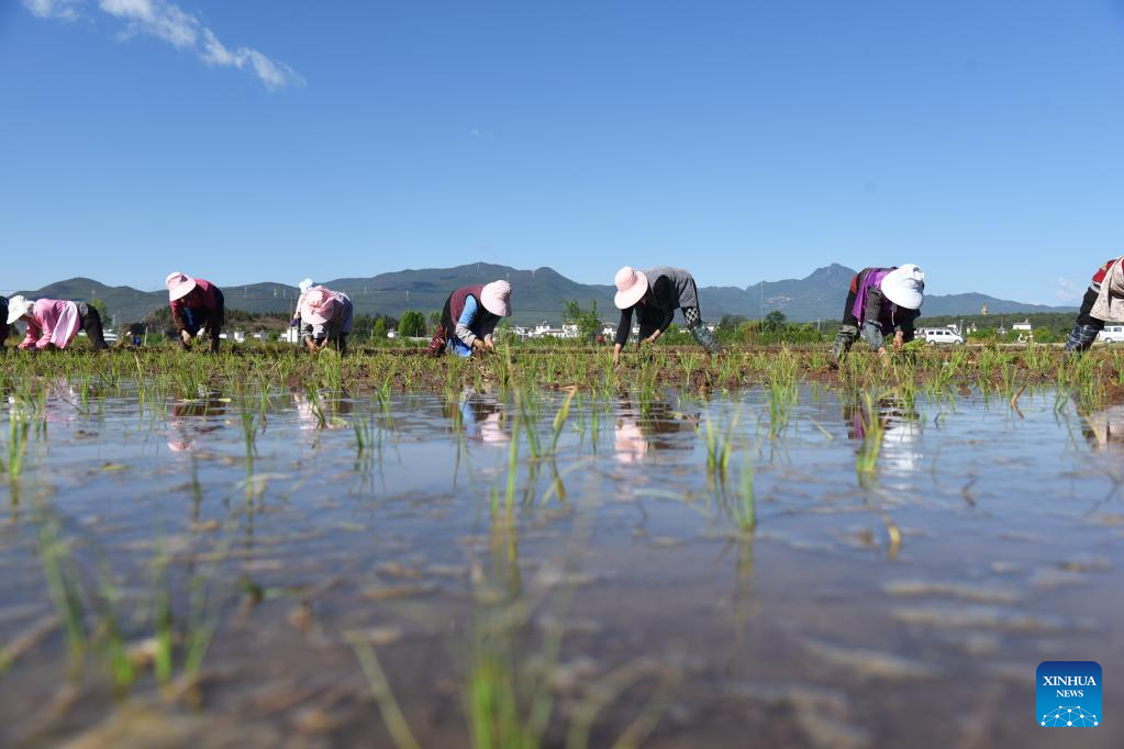 Farmers plant seedlings at a field in Dongyuan Community of Lijiang City, southwest China's Yunnan Province, May 6, 2023. Chinese farmers are busy with field works during "Lixia", the seventh solar term on the Chinese lunar calendar that marks the beginning of summer. (Photo by Zhao Qingzu/Xinhua)