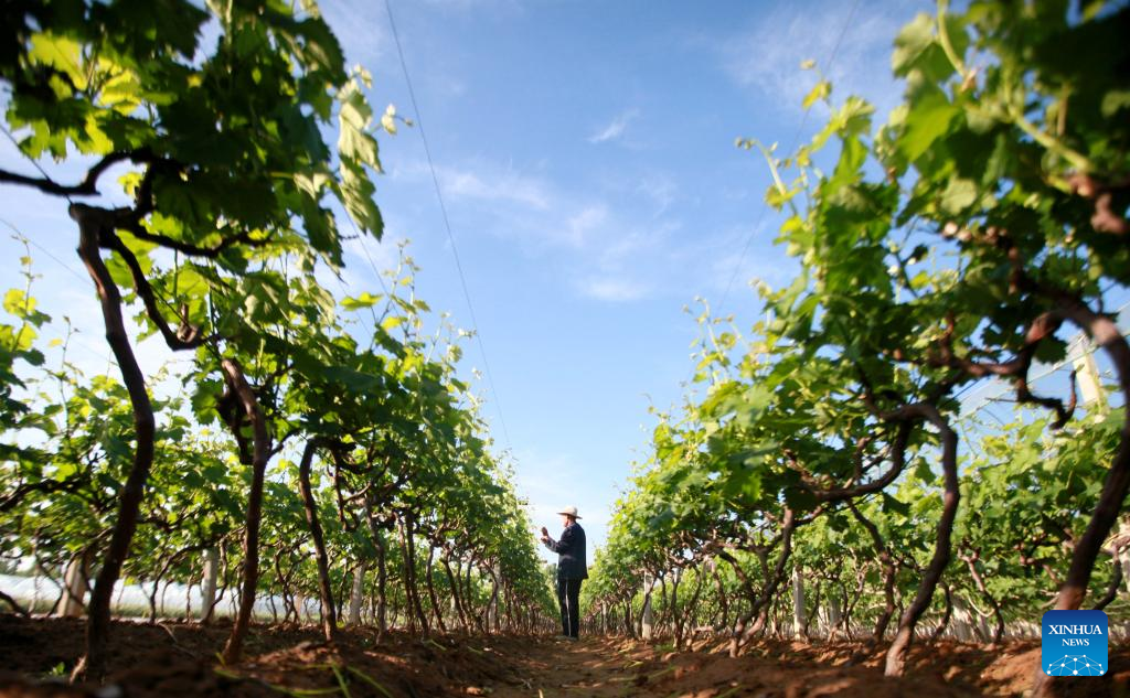 A farmer takes care of grapes in a field in Pingyi County, Linyi City of east China's Shandong Province, May 6, 2023. Chinese farmers are busy with field works during "Lixia", the seventh solar term on the Chinese lunar calendar that marks the beginning of summer. (Photo by Wu Jiquan/Xinhua)
