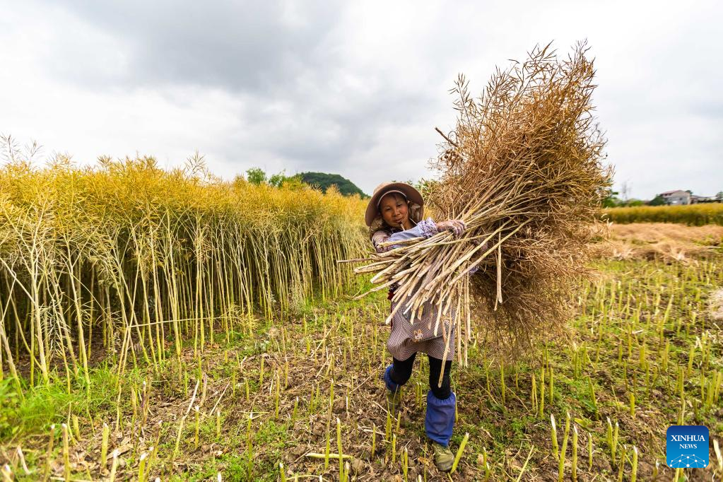 A farmer harvests rapeseeds in a field in Baojiatun Village, Anshun City of southwest China's Guizhou Province, May 6, 2023. Chinese farmers are busy with field works during "Lixia", the seventh solar term on the Chinese lunar calendar that marks the beginning of summer. (Photo by Chen Xi/Xinhua)