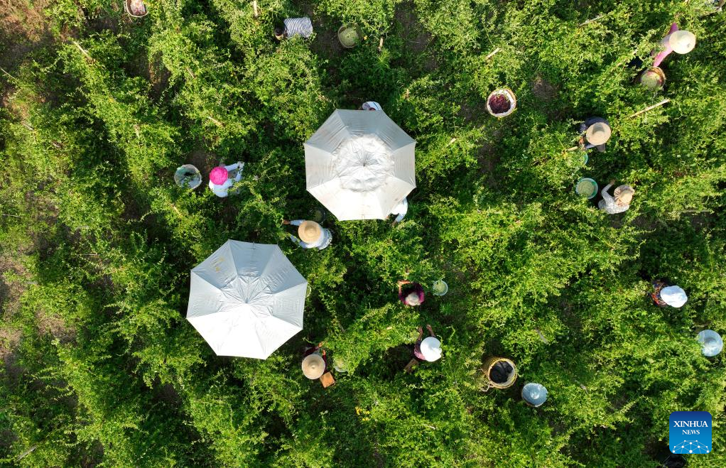 This aerial photo taken on May 5, 2023 shows farmers picking honeysuckle in a field in Huajiaping Village, Guang'an City of southwest China's Sichuan Province. Chinese farmers are busy with field works during "Lixia", the seventh solar term on the Chinese lunar calendar that marks the beginning of summer. (Photo by Xia Junlin/Xinhua)