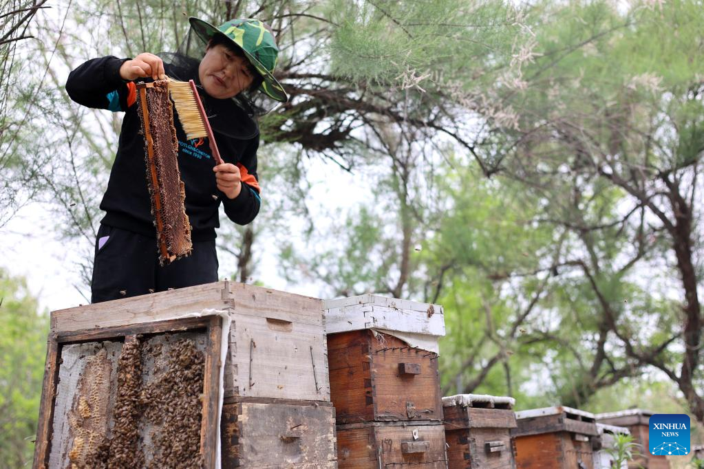 A farmer collects honey in Wudi County, Binzhou City of east China's Shandong Province, May 5, 2023. Chinese farmers are busy with field works during "Lixia", the seventh solar term on the Chinese lunar calendar that marks the beginning of summer. (Photo by Chu Baorui/Xinhua)
