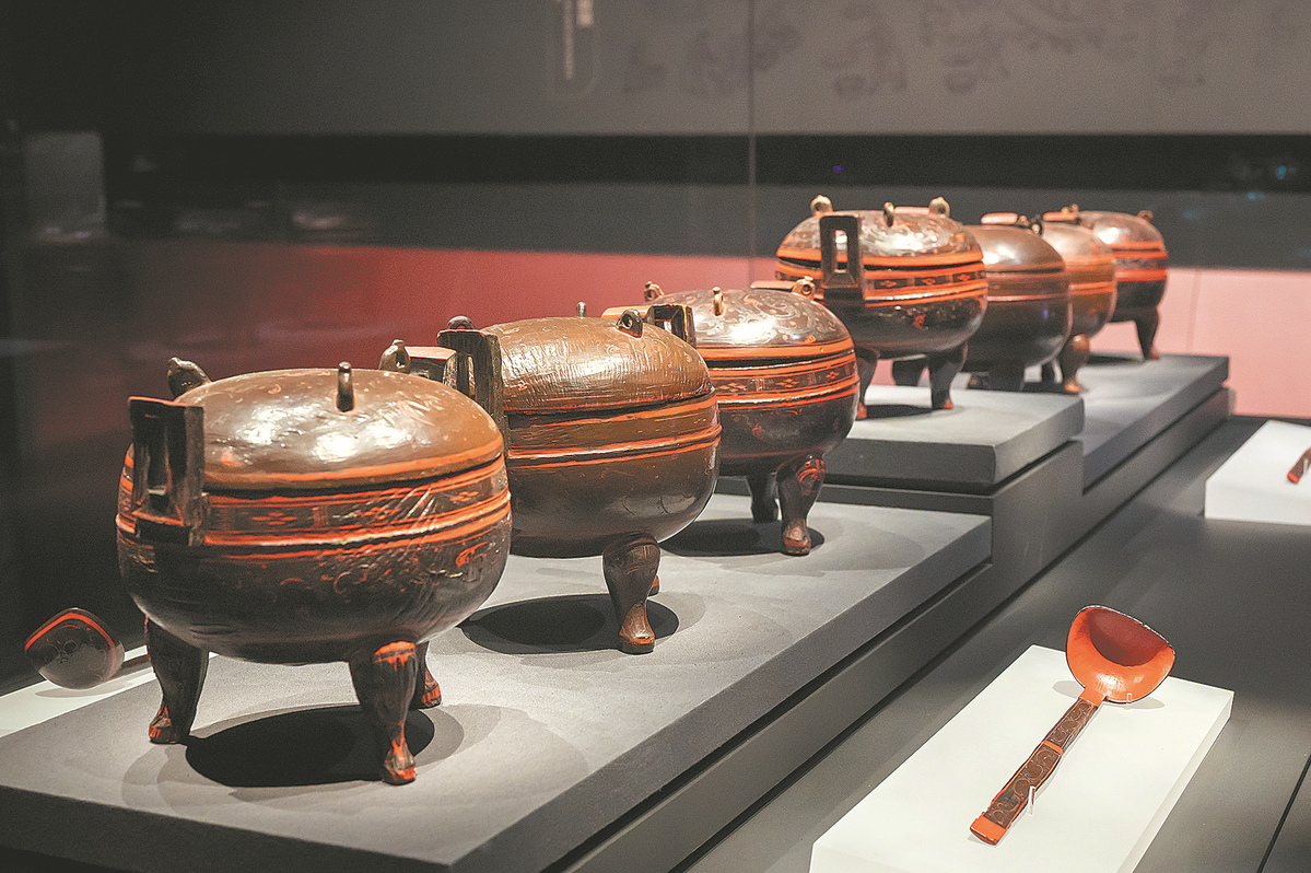 Lacquerware jars unearthed from the Mawangdui Tombs are on display in the museum on May 13. [Photo provided to China Daily]