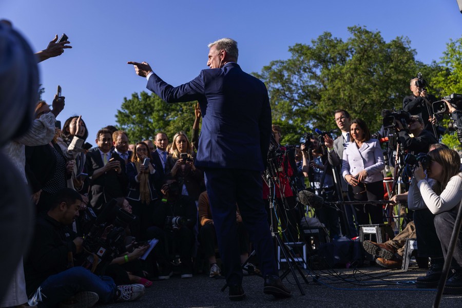 Republican House Speaker Kevin McCarthy speaks to the press after a high-profile debt ceiling meeting in Washington, D.C., the United States, May 9, 2023. (Photo by Aaron Schwartz/Xinhua)