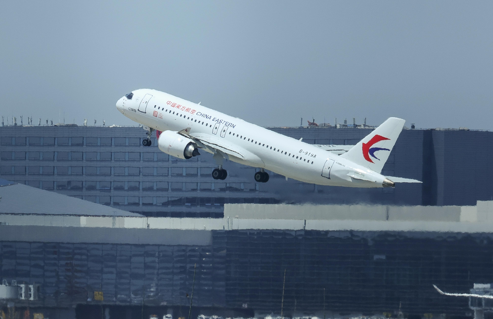 A C919 large passenger aircraft, China's first self-developed trunk jetliner, takes off from Shanghai Hongqiao International Airport in east China's Shanghai, May 28, 2023. [Photo/Xinhua]