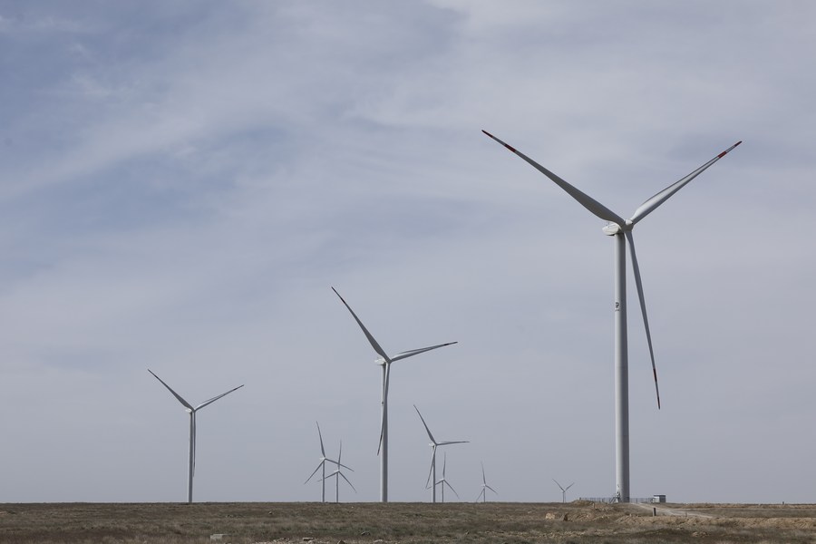 This photo taken on April 3, 2023 shows some wind turbine generators of the 100-MW Zhanatas wind farm in Zhanatas, Kazakhstan. (Photo by Kalizhan Ospanov/Xinhua)